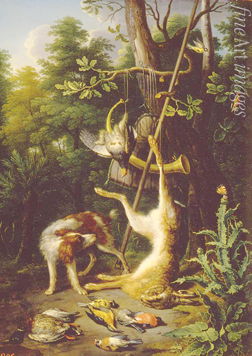 Keywords: Summer, Nature, Wild, Barock, Still life, Dead Hare, Hunt, Hound, Hunt bag, Poultry, Dog and game birds, Hunting horn, Pointer, Game bag, Birds, Animals representation, Flemish Painting