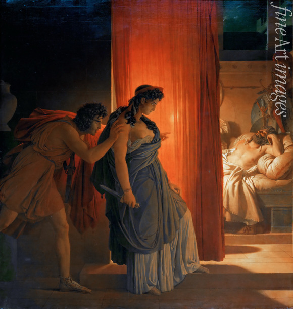 Clytemnestra hesitates before killing the sleeping Agamemnon