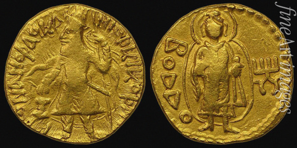 Gold Coin, Kushan. Obverse: Kanishka I. Reverse: in Bactrian script Buddha (boddo)