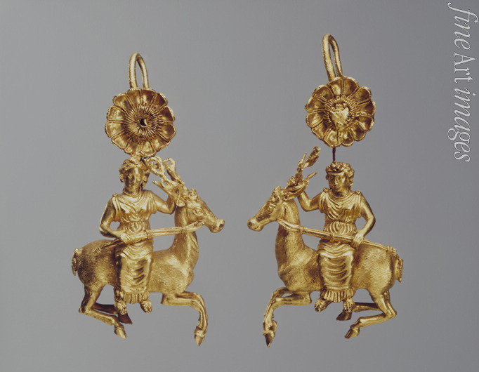 Pair of gold earrings with a figure of Artemis
