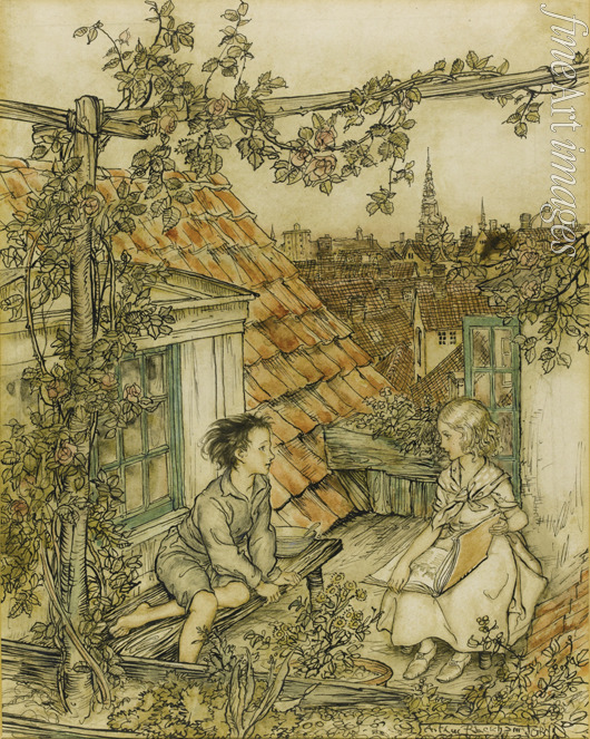 Kay and Gerda in their garden high up on the roof. Illustration for the tale of The Snow Queen