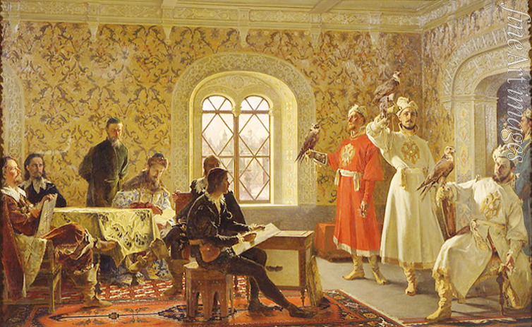 Italian Ambassador Calvucci drawing the favourite falcons of Tsar Alexei Mikhailovich