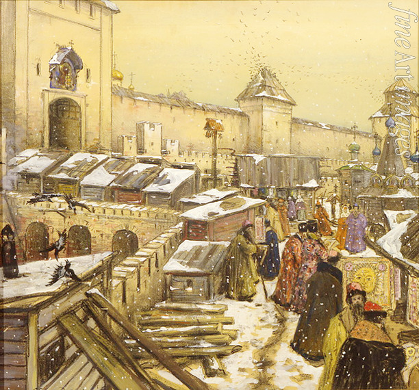 Keywords: Winter, Cityscape, Russian architecture, Town, Tradition, City, Genre scene, Folklore, Traditional, Architecture, Moscow, Russian History, Russian winter, Kremlin, Moscow Kremlin, History of Russia, Muscovy, Moscow principality, Grand Duchy of Moscow, Ancient Russia, Muscovite boyar, Knyaz, Russian folklore, Bookshop, Peredvizhniki, The Wanderers, The Itinerants, Moscow in the 17th century, Christ the Saviour Bridge