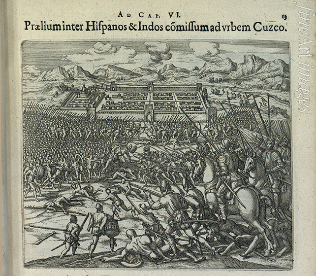 Battle between the Spaniards and the Indians at the gates of Cuzco. From: Americae pars sexta, sive Historiae ab Hieronymo Benzo