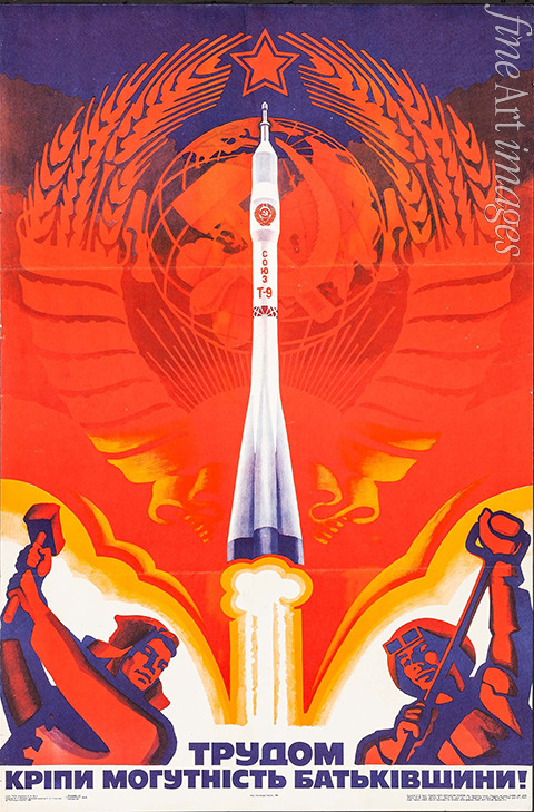 Symbol, Russia, Soviet political agitation art, Space, Propaganda, Poster, Political Poster, Universe, Agitation, Socialist realism, Socrealism, Spaceflight, Launch pad, Astronautics, Astronaut, Cosmos, Soviet space program, Soyuz T-9