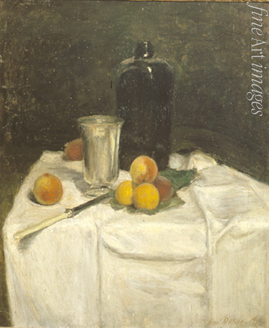 Keywords: France, Fruits, Wine, Wine bottle, Bottle, Peaches, Silverware, Knife, White tablecloth, At the Table, Impressionism, Impressionists, The bottle of Schiedam