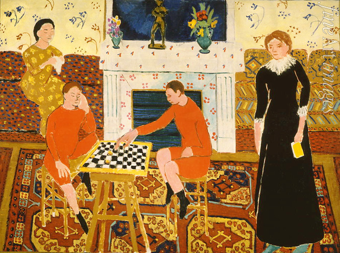 Keywords: Flowers, Decorative, Fauvism, France, Carpet, Lady, Woman, Interior, Family life, Child, Rest, Play, At the Table, Fireplace, Weekday, Daily, Everyday, Home, Vases, Family scene, Peace, Sitting room, Living room, In the room, Flat, Family portrait, Draughts, Painter's Family, Checkers Game, Draughts Game