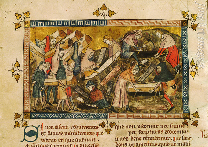 The burial of the victims of the plague in Tournai. Miniature from: Tractatus quartus by Gilles de Muisit