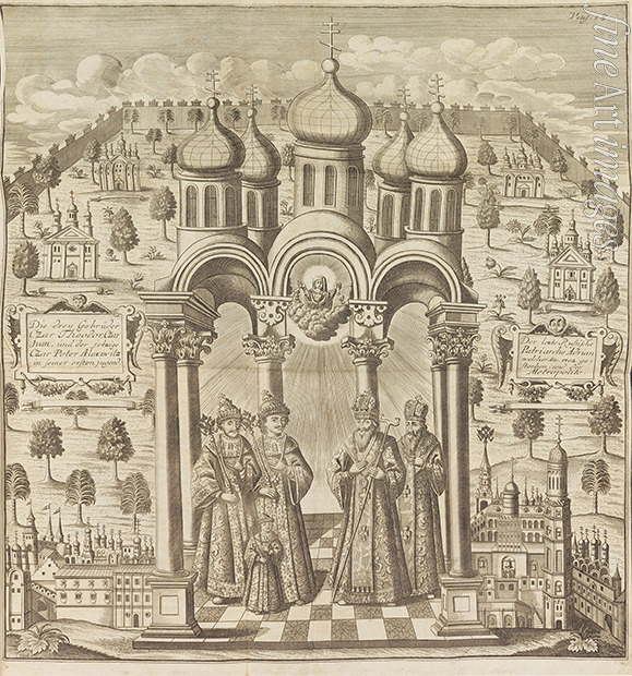 Feodor III, Peter I, Ivan V and Patriarch Adrian I. From Das veraenderte Russland (The Present State of Russia)