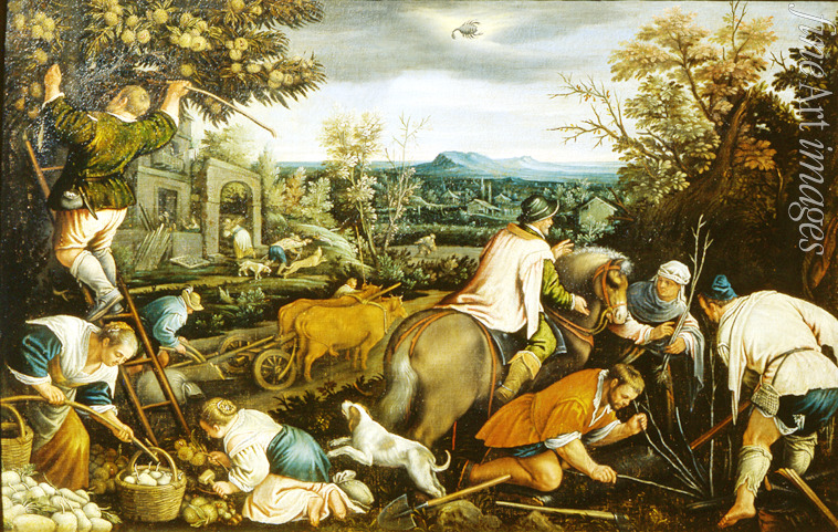 Country side, Seasons, Poetry, Autumn, Noon, Time of Day, Peasant, Italy, Family life, Jug, Renaissance, Peasant woman, Baskets, Keg, Vat, Peasants, Italian landscape, Weekday, Daily, Everyday, Peasant family, Farmer, Farmer woman, Peasant life, Job, Harvest, Traditional dress, Fall, October, Vegetable harvest, Vegetable, Vegetable bed, Market garden, Zodiac, Calendar, Rural activities, Signs of the Zodiac, Labours of the Months