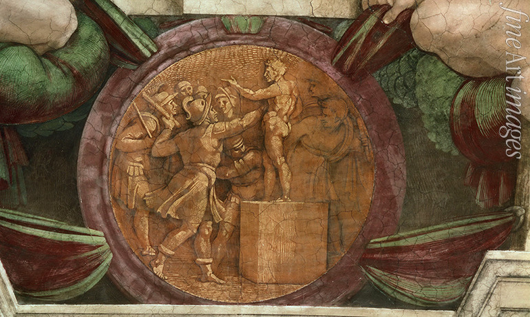 Medallion represents the Destruction of the Statue of the God Baal (Sistine Chapel ceiling in the Vatican)