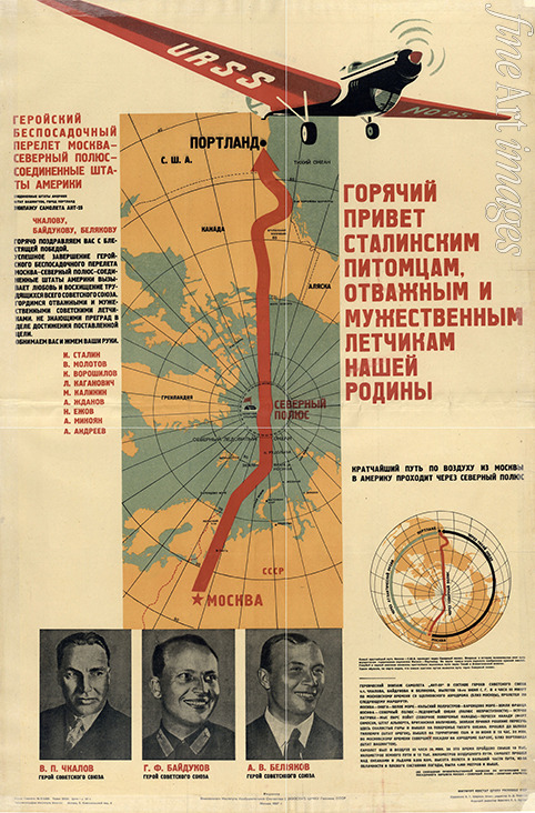 Keywords: Russia, Soviet political agitation art, Defence, North Pole, Aeroplane, Flight, Red Army, Soviet Union, Propaganda, Dictator, Poster, Political Poster, Political agitation, Airplane, Aircraft, USSR, Aviation, Airfield, Airspace, Josef Stalin, Stalin, Leader of the Soviet Union, General Secretary, First Secretary of the Central Committee of the Communist Party, Leader, Stalinism, Soviet, Politic, Socialism, Socialist realism, Socrealism, Joseph Stalin, Airship, Alexander Belyakov, Belyakov, Georgiy Baidukov, Baidukov, Valery Chkalov, Chkalov, Polar route, Tupolev ANT-25