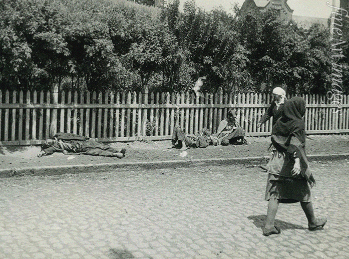 The victims of hunger. Pedestrians and corpses of starved farmers on a street in Kharkiv