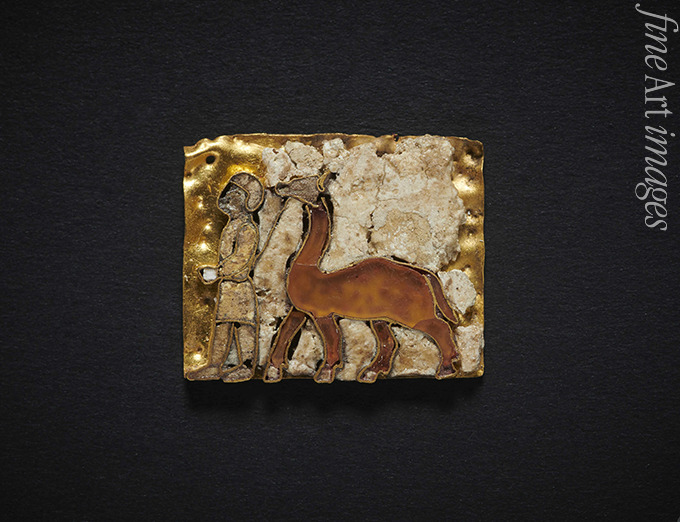 Votive plaque in cloisonné with man leading a camel. From the Oxus Temple, Takht-i Sangin
