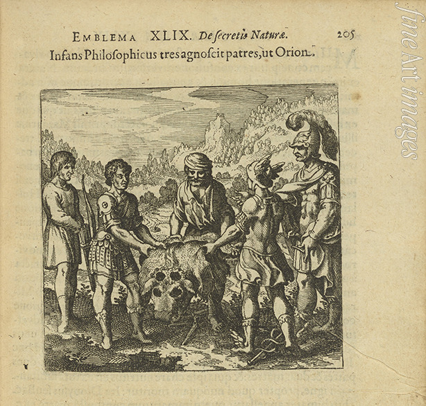 Title:Emblem 49. The Philosophic child acknowledges three fathers, like Orion. From Atalanta fugiens by Michael Maier