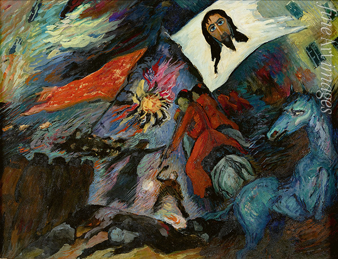 Cityscape, Symbol, Russia, Demonstration, Proletariat, Revolution, Russian Revolution, Town, People, City, Allegory, Anxiety, Blue Rider, Expressionism, Russian winter, Power, Proletarian, Red banner, National uprising, October revolution, Manifestation, 1917, Der blaue Reiter, Expressionist