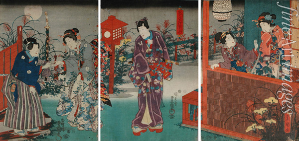Colorful Flowering Grasses in the Light of the Full Moon (Monaka no tsuki iro no kusabana). Triptych