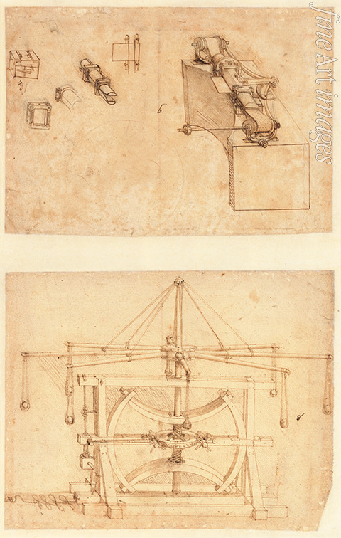 Leonardo da Vinci - Codex Atlanticus, folio 159 recto: parts of a needle-making machine;  a stone-throwing machine