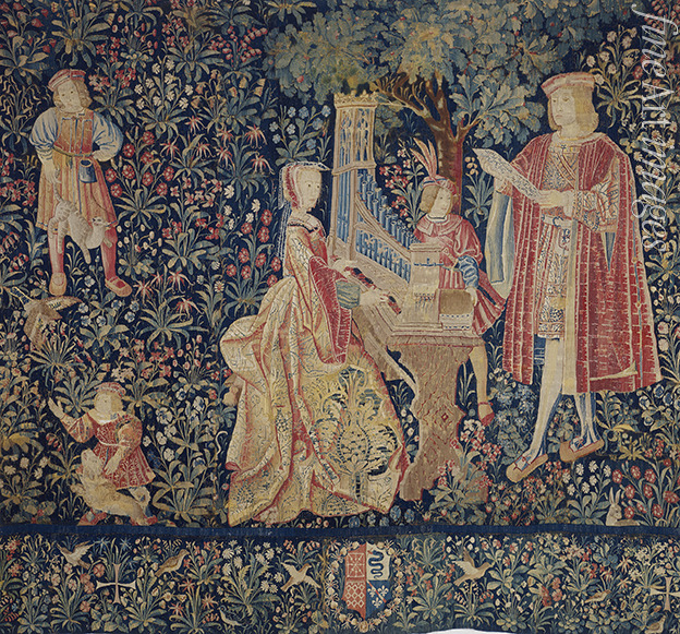 Tapestry, Organist, Five Senses, Senses, Organ, Unicorn, Hearing, Positive organ, Positiv organ, Positif organ, Portable organ, Chair organ, Tapestries, Woven textile art