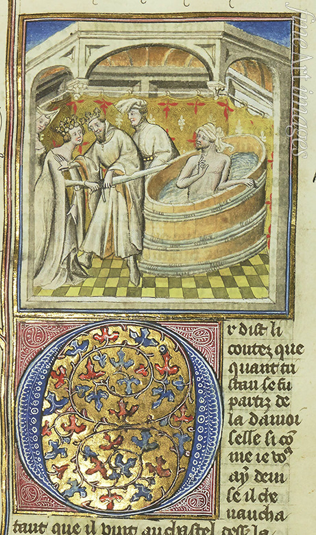 Nude, Nudity, Bathing, Sauna, Bath, Steam Bath, Toilet, Thermae, Health, Middle Ages, Manuscript, Manuscript illumination, Medieval, Illuminated manuscript, Medieval Illuminated Letter, Illuminated art, Bathhouse, Hygiene, Bathing-Place, Bathing Place, Hot spring, Miniature, Toilette, Thermal Springs