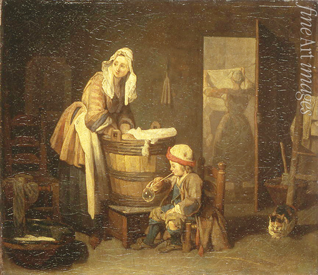 Poetry, France, Melancholy, Woman, Loneliness, Sadness, Motherhood, Family life, Child, Poverty, Rococo, Mother, Daily, Everyday, Washing, Genre scene, Cat, Washerwoman, Uneasiness, Laundress, Laundry, Work, Washhouse, Soap bubble, Maternity, Bubbles, Soap-bubbles, Washerwomen