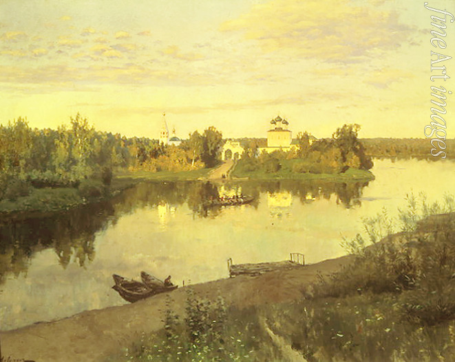 Sommer, Natur, Jahreszeiten, Poesie, Sonnenuntergang, Licht, Tageszeiten, Lichtwirkung, Am Ufer, Fluß, Ländlich, Abend, Impression, Russland, Kirche, Am Wasser, Boot, Ruhe, Friede, Stille, Abendläuten