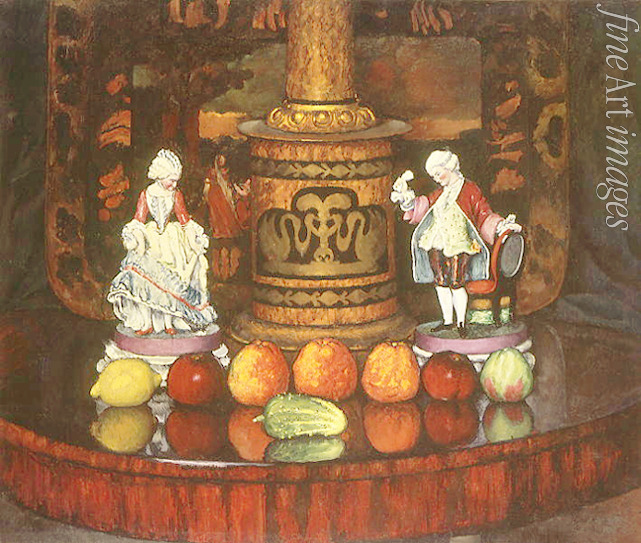 Äpfel, Porzellan, Holz, Auf dem Tisch, Zitrone, Modern, Russische Avantgarde, Oval, Stilleben mit Porzellanfiguren, Meissen, Gurke, Schellbube, Karo-Bube