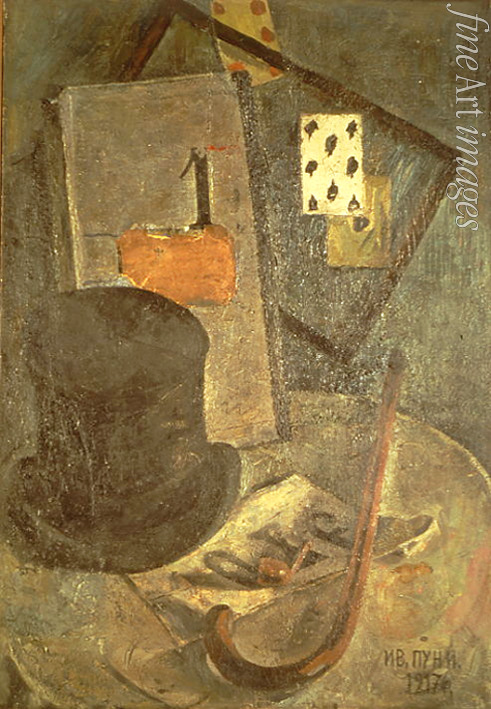 Tageszeiten, Abend, Auf dem Tisch, Stilleben, Kartenspiel, Spiel, Spielen, Russische Avantgarde, Spazierstock, Dandy, Zylinderhut, Kartenspieler, Karte, Spielkarte, Jean Pougny, Pougny, Pougni, Seiden-Zylinder, Zylinder, Glanzzylinder