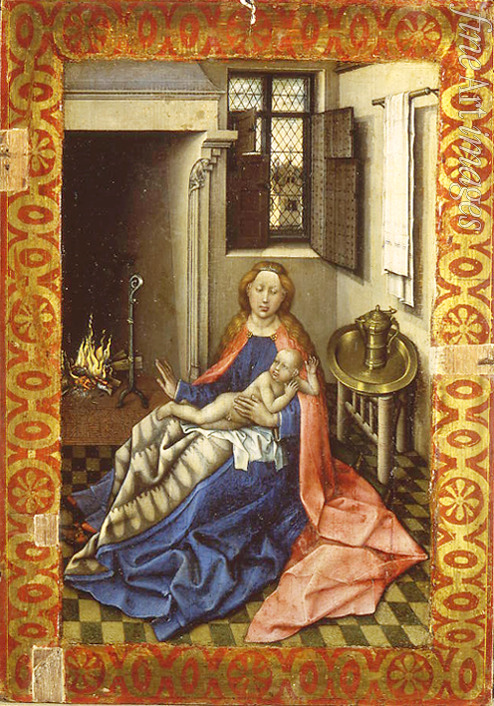 Glück, Mutterschaft, Madonna, Interieur, Familienleben, Bibel, Familie, Renaissance, Neues Testament, Maria, Gottesmutter, Jesuskind, Heilige Familie, Niederlande, Kamin, Jungfrau, Christuskind, Heim, Maria mit dem Jesuskind am Kamin, Marienbild, Christusbild, Marienfigur, Madonnenbild, Altniederländische Malerei, Marienbildnis