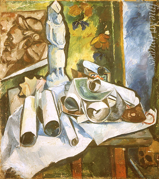 Auf dem Tisch, Interieur, Statuette, Zeichnung, Kunst, Kunstliebhaber, Skulptur, Frauenkunst, Russische Avantgarde, Expressionismus, Zeichnen, Stilleben mit Papierrollen, Papier, Kubofuturismus