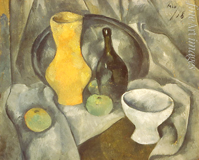 Fauvismus, Tischdecke, Wein, Weinflasche, Flasche, Tablett, Russland, Auf dem Tisch, Gedeckter Tisch, Krug, Schüssel, Stilleben, Russische Avantgarde, Apfel