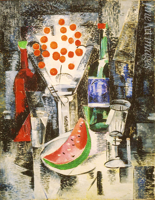 Vase, Dekorativ, Farbigkeit, Weinglas, Flasche, Kubismus, Rhythmus, Auf dem Tisch, Frauenkunst, Fest, Modern, Melone, Konstruktivismus, Russische Avantgarde, Stilleben mit Vase und Flaschen, Kirschen, Wassermelone, Gratulation, Kubofuturismus