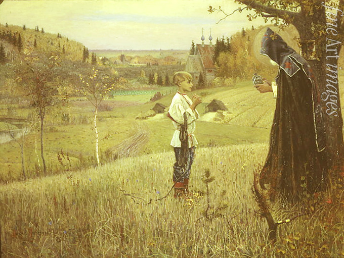 Natur, Jahreszeiten, Poesie, Herbst, Feld, Symbolismus, Fluss, Hügel, Russland, Kirche, Herbstlandschaft, Gebet, Eremit, Mönch, Heiliger, Treue, Wunder, Russische Geschichte, Heiligen, Orthodoxe Kirche, Russische Kirche, Russische Geschichte, Glaube: Orthodoxe Kirche, Vision, Sergius von Radonesch, Heiliger Sergius von Radonesch, Heilige Sergius, Bartholomäus, Wundertäter, Die Vision des Knaben Bartholomäus, Heilige Bartholomäus, Sergij von Radonesch, Heiliger Sergius
