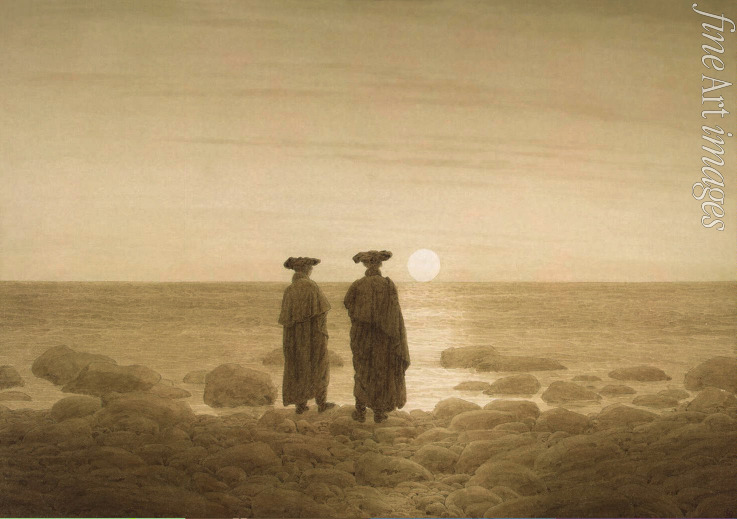 Natur, Poesie, Meer, Meereslandschaft, Küste, Meeresküste, Nostalgie, Romantik, Wasser, Felsen, Ufer, Vergänglichkeit, Romantische Landschaft, Aquarell, Mond, Deutschland, Zwei Männer, Betrachtung, Nacht