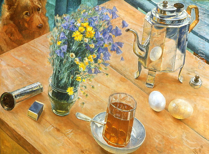 Blumen, Morgen, Tageszeiten, Landhaus, Im Zimmer, Frühstück, Tagesanbruch, Russland, Auf dem Tisch, Familienleben, Familie, Hund, Blumenstrauss, Tee, Teekanne, Heim, Teeglas, Eßzimmer, Ei, Eier, Morgendliches Stilleben, Bouquet