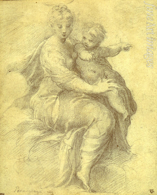 Idyll, Liebe, Freude, Mutterschaft, Madonna, Bibel, Renaissance, Neues Testament, Maria, Gottesmutter, Jesuskind, Heilige Familie, Mutter, Christi, Graphik, Zeichnung, Jungfrau, Christuskind, Madonna und Kind, Jesu, Marienbild, Madonna und Kind zwischen Wolken, Marienfigur, Madonnenbild, Marienbildnis