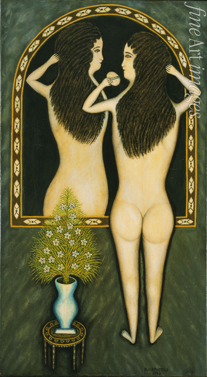 Nackt, Nacktheit, Nackte Frau, Körper, Frau, Naive Kunst, Junge Frau, Spiegel, Toilette, Nachthemd, Akt, Negligé, Negligée, Morgenmantel, Boudoir