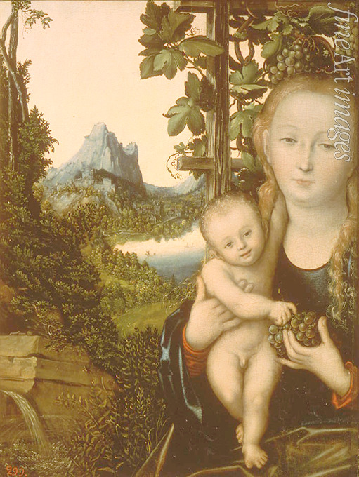 Sommerlandschaft, Tal, Berglandschaft, Berg, Bibel, Renaissance, Neues Testament, Maria, Madonna mit dem Kind, Gottesmutter, Jesuskind, Heilige Familie, Madonna mit Weintraube, Weinstock, Quelle, Deutschland, Marienbild, Marienfigur, Madonnenbild