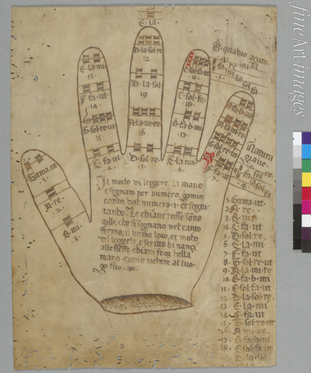 Musik, Lied, Musikinstrumente, Musiker, Musikant, Musizieren, Singen, Melodie, Handschrift, Mittelalter, Buchmalerei, Manuskript, Bilderhandschrift, Guido von Arezzo, Guido Aretinus, Guido da Arezzo, Guido Monaco, Guido d'Arezzo, Guidonische Hand, Mittelalterliche Musik, Miniatur