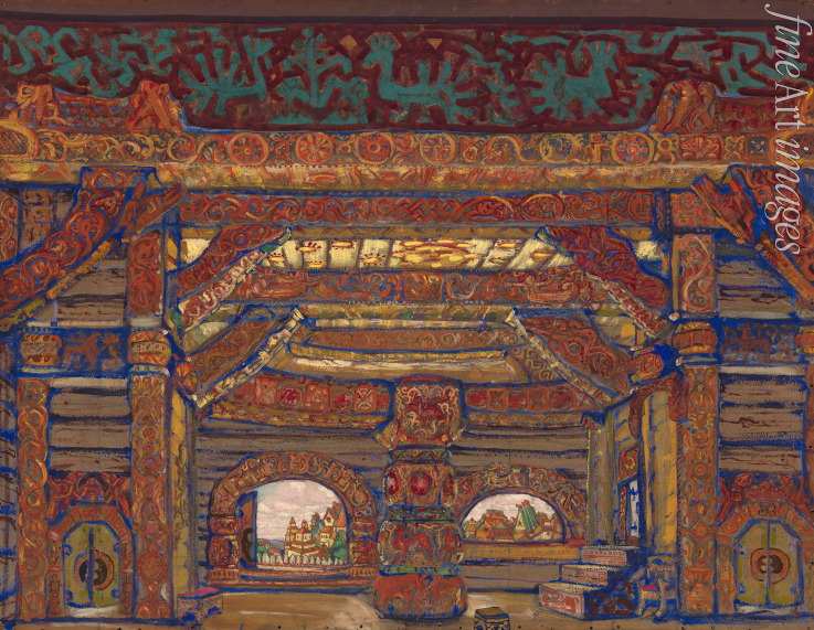 Ballett, Märchen, Theater, Oper, Bühnenbild, Bühnenmalerei, Bylina, Rimski-Korsakow, Ostrowski, Nicholas Roerich, Roerich, Rerich, Schneeflöckchen, Snegurotschka, Schneemädchen, Russische Folklore, Szenenbild, Szenografie, Theatermalerei, Berendei, Berendej