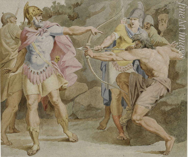 Philoktet zielt mit dem Bogen des Herakles auf Odysseus
