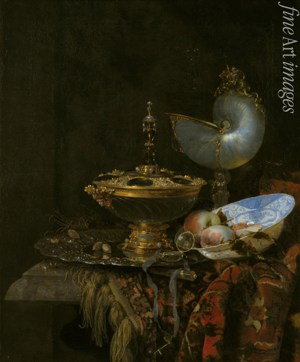 Prunkstilleben mit Holbein-Schale, Nautilusbecher, Glaskelch und Obstschale