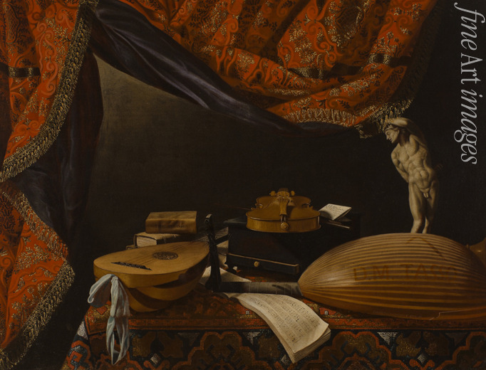 Musik, Am Tisch, Musikinstrumente, Violine, Flöte, Italien, Interieur, Barock, Musiker, Musikant, Musizieren, Bücher, Laute, Geige, Noten, Notenblätter, Partituren, Flötenspieler, Gitarre, Notenblatt, Globus, Stilleben mit Musikinstrumente, Flötist, Gitarrist, Gitarristin, Italienische Malerei, Musikinstrument, Lautenist, Lautenistin