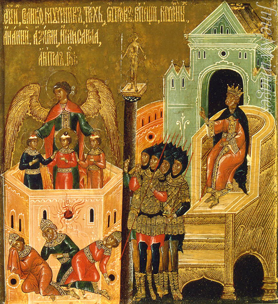 Ikone, Ikonenmalerei, Bibel, Altes Testament, Buch Daniel, Gebet, Gott, Prophet, Auferstehung, Orthodoxe Kirche, Russische Kirche, Himmelfahrt Christi, Christi Himmelfahrt, Auferstehung Christi, Tanach, Drei Jünglinge im Feuerofen, Schadrach, Meschach, Abed-Nego, Abednego, Nebukadnezar, Propheten, Weisen, Feuerofen, Babel, Babylon, Nebukadnezar II.