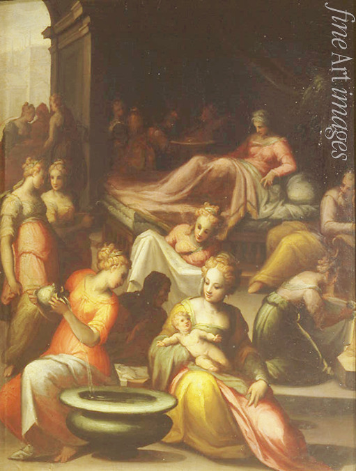 Baden, Glück, Zärtlichkeit, Mutterschaft, Mutterliebe, Mutter und Kind, Bad, Interieur, Familienleben, Kind, Schüssel, Bibel, Familie, Renaissance, Neues Testament, Jesuskind, Mutter, Märtyrer, Christuskind, Christentum, Genreszene, Martyrium, Theologie, Heiliger, Treue, Apostel, Heiligen, Jesus Christus, Die Geburt Johannes des Täufers, Johannes der Täufer, Elisabet, Evangelien, Apostelgeschichte, Johannesknabe, Prophet, Hebamme, Jünger von Jesus, Elisabeth, Evangelist, Geburt