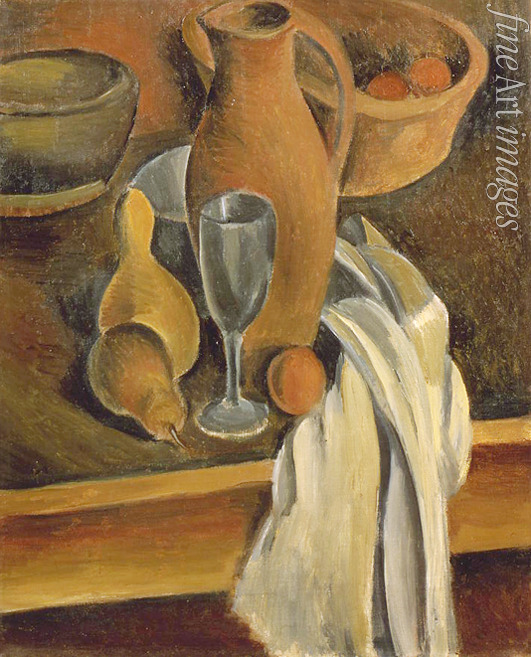 Stilleben mit Tonkrug, weisser Serviette und Obst