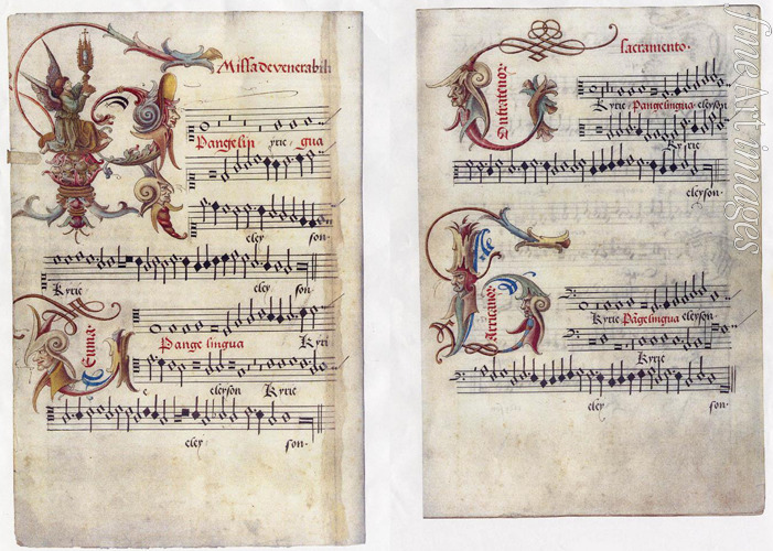 Musik, Lied, Musikinstrumente, Musiker, Musikant, Musizieren, Singen, Melodie, Handschrift, Buchmalerei, Manuskript, Bilderhandschrift, Missa Pange lingua, Pange lingua, Ordo Missae, Desprez, Des Prez, Musik der Renaissance, Miniatur