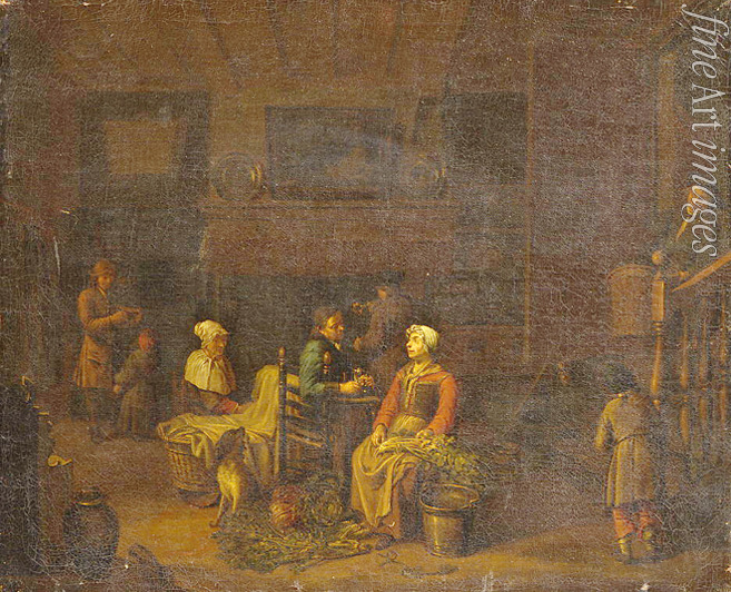 Gespräch, Dienerschaft, Familienleben, Barock, Küche, Gemüse, Kochen, Kochin, Alltag, Haushalt, Herd, Ofen, Küchentisch, Küchenszene, Gastronomie, Flämische Malerei, Esskultur, Kochkunst, Köchin, Kulinarie