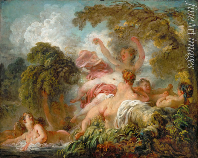 Sommer, Frankreich, Natur, Jahreszeiten, Poesie, Sommerlandschaft, Nackt, Nacktheit, Gesellschaft, Nackte Frau, Am Ufer, Fluß, Damen, Badende, Am Wasser, Belustigung, Rokoko, Unterhaltung, Galant, Amüsant, Galan, Galante Gesellschaft