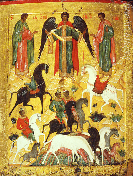 Pferd, Ikone, Ikonenmalerei, Pferde, Märtyrer, Christentum, Martyrium, Heiliger, Brauchtum, Wunder, Heiligen, Gutes und Böses, Christliche Mythologie, Beschützer, Orthodoxe Kirche, Russische Kirche, Schutzheiliger, Wundertäter, Wohltäter, Schutzpatron, Erzengel Michael, Florus und Laurus, Laurus, Florus, Wunder von Florus und Laurus, Heiliger Florus, Heiliger Laurus